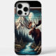 A majestic bull moose stands in a moonlit forest, with a mountain peak and a winding river in the background.
