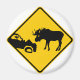 International style road and highway sign advising that the moose will win any confrontation with a car. Sign was reported seen in Gros Morne National Park, Newfoundland, Canada.