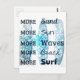 Fun print features all the things beach lovers want : MORE beach, sun, sand, waves and surf. Shades of blue with trio of surboards in background.