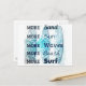 Fun print features all the things beach lovers want : MORE beach, sun, sand, waves and surf. Shades of blue with trio of surboards in background.