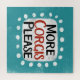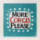 "More Corgis Please" is a cute text design in blue with black and red text, along with a white accent shape and white textured whimsical dots surrounding it.