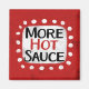 "More Hot Sauce" is a cute text design in red with black and red text, along with a white accent shape and white textured whimsical dots surrounding it.