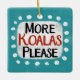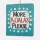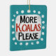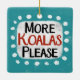 "More Koalas Please" is a cute text design in blue with black and red text, along with a white accent shape and white textured whimsical dots surrounding it.