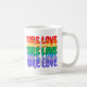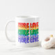 This image features the phrase "MORE LOVE" repeated multiple times in a bold, playful font. The text is arranged in three distinct rows, each with unique colours and styles. The top row showcases "MORE LOVE" in shades of red, orange, and yellow, blending into a warm gradient. The middle row highlights the phrase in vibrant green and teal, standing out prominently. The bottom row transitions into cool tones of blue and purple, with a slight reflection effect beneath it, creating a sense of depth and movement. The background is transparent, making this design versatile. The overall composition conveys a positive, inclusive, and uplifting message.