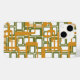This phone case has a mid-century modern design of open rectangles in gold over open rectangles in green.