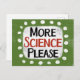 "More Science Please" is a cute text design in green with black and red text, along with a white accent shape and white textured whimsical dots surrounding it.