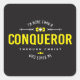 "More Than A Conqueror" Christian typography design badge. Type in emblem style with yellow and black letters states, "I'm more than a Conqueror through Christ who loved me." Scripture reference is from Romans 8:37.