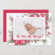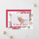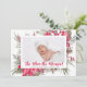 An elegant poinsettia, holly and pine arrangement frames your baby photo on the front of this Christmas birth announcement. There is a second photo on the announcement back with birth stats and personalised sentiment. This photo and text are framed with a botanical pattern.