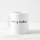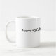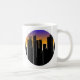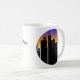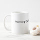 A white mug with "Morning Coffee" written on it and a stylised picture of dawn rising over a city printed on the mug too.