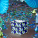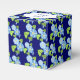 This pretty floral pattern features morning glory blossoms in various shades of blue with white and yellow accents and green leaves.