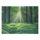 Sunlight filters through tall, dense trees, casting a radiant glow over a lush, green forest floor dotted with delicate white flowers. The serene environment evokes a sense of peace and tranquillity.