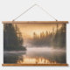 River flows between huge pine trees, Mist rises off the cold morning water through to the pines