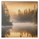 River flows between huge pine trees, Mist rises off the cold morning water through to the pines