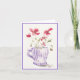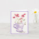 A delightful watercolor greeting card showcases a cluster of vibrant poppies arranged inside a charming coffee cup adorned with soft lavender stripes. The poppies, painted in loose, expressive brushstrokes, bloom in warm coral and red tones, their delicate, ruffled petals layered with subtle washes of pink. Slender green stems and airy leaves spill naturally from the cup, adding movement and freshness.