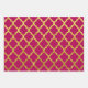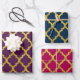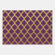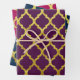 Moroccan arabesque quatrefoil style print in faux gold on three different colors. Tones of golden yellow designed to simulate the color, texture and shine of metallic hammered gold or gold leaf. Purple, blue and dark pink.