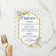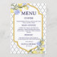 The combination of decorative tile motifs and sunny lemons evokes the relaxed luxury of Mediterranean coastlines, making this menu card ideal for destination weddings, summer ceremonies, Italian, Greek, Spanish, or Moroccan–inspired themes, and outdoor receptions. The balanced layout keeps the menu clear and readable while allowing the corner artwork to frame your dining details beautifully.