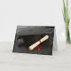 Graduation card with a mortarboard, diploma with a red ribbons and a graduation gown.
