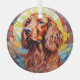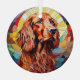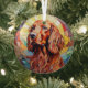 Here's a pretty glass ornament with a stained glass theme, featuring a beautiful red Irish Setter dog. The dog is set against a multi colour mosaic background. Colours include blue, gold, maroon red, cream, and more. This makes a nice stocking stuffer or decoration for the household who loves an Irish Setter.