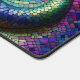 A stylised mermaid showcases a mosaic of shimmering tiles in vibrant hues of blue, green, purple, and orange. The lighting enhances its metallic lustre, while an abstract background complements its artistic form.