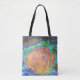 This abstract tote bag features a bright mosaic pattern the captures the unique colouring and pattern of a polished abalone shell. The vibrant orange, teal, and purple colouring spirals around the centre of this photo featured on both the front and back of this tote bag.