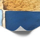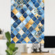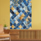 Design: Tiles in varying shades of blue form the background, decorated with golden floral and plant motifs.