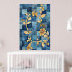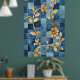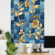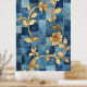 Design: Tiles in varying shades of blue form the background, decorated with golden floral and plant motifs.