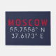 Moscow, Russia longitude and latitude coordinates in distressed fonts give this a modern urban look. Dark blue background with red and white text