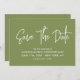 Modern calligraphy save the date in moss green colour with a digital scannable QR code for a website or contact information on the back.
