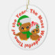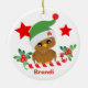 This cute Christmas ornament has an image of a big eyed cartoon owl with a baby owl. The larger owl is dressed in a green hat and scarf, and the baby owl is wearing a red and white striped hat. The owl images are framed by the circle text The Most Wonderful Time of the Year, and placed on a white background. The back of the ornament has another cute owl image perched upon a candy cane, with holly sprigs and red stars scattered about. Your custom text is in red at the bottom. Fun for kids!
