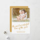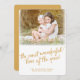 A modern greeting that states "the most wonderful time of the year" in gold on white and sends casual contemporary greetings to family and friends with this double-sided photo card. A large size photo of your family on the front is framed with a soft focus effect and tiny dots of snow, then accented by cursive gold tone typography below. There's also space on the back for your customised message and additional photos if you choose. Simple and lovely.