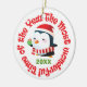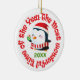 This cute Christmas ornament has an image of a little fat penguin dressed in a Santa hat and striped scarf. He is holding a brightly wrapped gift, and is framed by the circle text The Most Wonderful Time of the Year. The penguin and red text are placed on a white background. Your custom text is in Holiday green below the penguin image. The back of the ornament has the same circle text which encloses a snowman wrapped in coloured Christmas lights. Fun for kids of all ages!