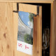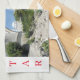 A beautiful view of Mostar Old Bridge in Bosnia and Herzegovina with the Old Town in the background printed on a souvenir tea towel.