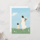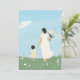 A serene illustration of a mother and child walking hand-in-hand through a vibrant meadow filled with white flowers. The mother, dressed in a flowing white dress, holds a bouquet of daisies, symbolising love and purity. The bright blue sky with soft clouds adds to the peaceful and joyful atmosphere.