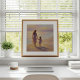 This impressionist-style painting captures a tender moment between mother and daughter as they walk together along a glowing shoreline.