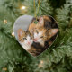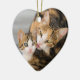 Mother cat fondly grooms and licks her young kitten tenderly, both faces side by side. Mutual grooming shows the friendly relationship between cats. This ceramic heart Christmas ornament is a gift idea for cat lovers. This cute and lovely kitty picture was photographed by Katho Menden http://www.zazzle.com/kathom_photo
