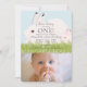 This cute birthday invitation features a portrait photo of a baby with a mother mountain hare / bunny and a baby hare / bunny on green grass and sky blue background. The reverse side features grey gingham background. Personalise it for your needs. You can find more bunny products at my store.