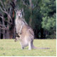 A perfect photo souvenir from Australia, this image shows a mother, or Mum, kangaroo standing upright with her baby Joey poking his head out from her pouch as they stand and graze in the grass in front of the trees in the background. Add optional name, vacation date or message to create your own unique Aussie souvenir photograph.