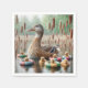 A serene pond scene features a mother mallard duck surrounded by her ducklings, each nestled in colourful inflatable toy float rings among tall cattails