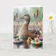 A serene pond scene features a mother mallard duck surrounded by her ducklings, each nestled in colourful floating rings among tall cattails.