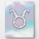 A mother of pearl nacre style Taurus Zodiac Symbol on a light pastel pink and blue print background. A modern urban elegant design for a great custom gift idea.