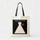 This mother of the bride tote bag features the words "Mother of the Bride" above a modern bridal gown and pink bouquet of roses on a black background. A great way to say thank you to your mother. Copyright Kathy Henis