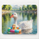 A serene scene features a white duck and a fluffy duckling floating together on a calm river, with the baby duckling inside a colourful inflatable ring
