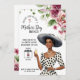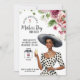 Step into a world of timeless elegance with this vintage-themed Mother's Day brunch invitation. The design features a graceful dark-skinned lady, dressed in a chic white dress adorned with classic black polka dots, complemented by a stylish gray hat. She holds a delicate glass of champagne, exuding sophistication and charm.