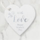 I think this must have been my fault when I ordered this heart tag. I truly thought it was ONE single tag that was around 3" across ( my mistake)...and on a good firm/thick art board, or something like that. Instead I received the product today and was just super disappointed. This was to hang on a really elegant wine bottle carrier for a wedding and instead this is not the single well crafted heart I expected...it is rather 'many very very tiny hearts....on normal white paper stock. I thought I was clear that this was a beautiful tag for an elegant wedding gift..not 20 little ( however many in the plastic bag there are) heart tags....which I suppose you could use for a bridal shower????maybe??? but they are not great..very thin and very tiny. SUPER disappointed but I have no time to return...I have to use two of these teensy tags ....it's just not non-plus. But again...maybe it was my mistake with the understanding of the measurements. The design is lovely...the tags themselves ARE NOT. If you need many, many many little tiny tags...maybe it will work for you...but otherwise...save your money. Not worth it. At all. The printing quality was good. It is the quality of the tag itself and absurdly tiny size of the tags.
