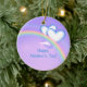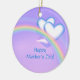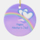 Pretty hanging ornament with my artwork of two white and blue hearts over a rainbow in a purple sky. Customisable text says "Happy Mother's Day".