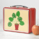 This awesome lunchbox features a digital art image of a series of leaves from a houseplant called a Monstera, also known as the Swiss Cheese Plant. The leaves are dark green and lobed and some have holes in them. The plant pot is red and contains some brown soil.