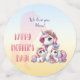 There is a unicorn silhouette image on the small confetti, and a unicorn pattern on the medium-sized confetti. The image on the large confetti shows a happy Momma unicorn, with her two children, on a gradient background. The text, "We love you, Mum!" on this image is customisable, and there is also the permanent text, "Happy Mother's Day!". Perfect for including at a unicorn-themed Mother's Day event!