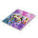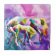 Brightly coloured, geometric horses stand against a swirling, psychedelic background. Vivid hues of purple, pink, and green blend with abstract patterns. Digital Art