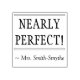 This inspiring rubber stamp design features the motivational message "NEARLY PERFECT!" and a personalised teacher name. It could be used by a school teacher, educator, instructor, or tutor when marking assignments, to acknowledge that the student has done a great job.