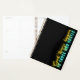 Motivational planner with "good things happen to those who hustle " quote in vertical yellow and aqua blue neon text. An inspirational design for any age!